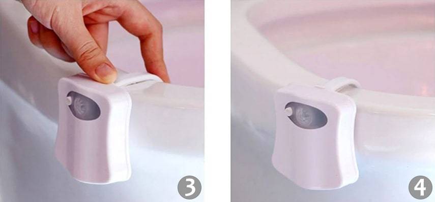 1. Разместите подсветку на ободке унитаза так, чтобы датчик смог уловить движение при входе в ванную комнату.