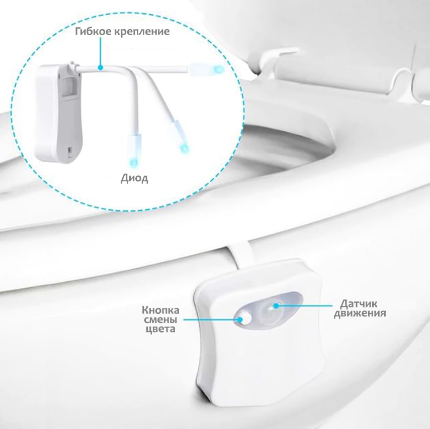 Подсветка оснащена датчиком движения. Когда Вы входите в туалет, светильник включается, а когда выходите – выключается. Вам не придется искать в темноте выключатель, умное устройство сделает все за Вас.